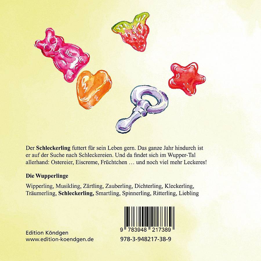 Der Schleckerling futtert für sein Leben gern. Das ganze Jahr hindurch ist er auf der Suche nach Schleckereien. Und da fi ndet sich im Wupper-Tal allerhand: Ostereier, Eiscreme, Früchtchen … und noch viel mehr Leckeres!